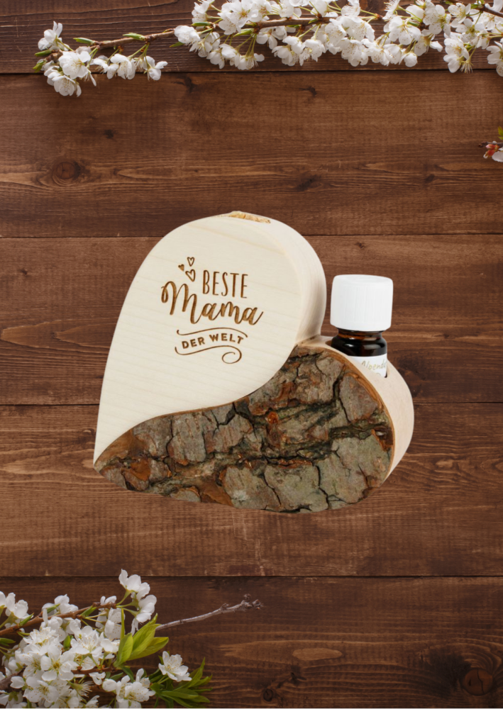 Natürlich, dekorativ und duftend: Das Rindenherz mit Gravur „Beste Mama der Welt“ vereint Aufbewahrung für Aromaöl und praktischen Duftspender in einem. Einfach aufstellen und Lieblingsplätze sowie alle Räume – von Schlafzimmer über Wohnzimmer bis Büro – im Handumdrehen beduften. Aromatherapie leicht gemacht!