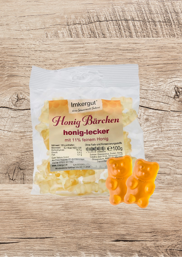 Die originalen Honigbärchen von Imkergut sind ein wahrer Genuss. Im praktischen 100g-Beutel sind sie perfekt zum Naschen zwischendurch. Mit einem Anteil von 11 % feinstem Bio-Honig aus der Schwarzwald-Imkerei von Imkergut kommt jeder Honig-Liebhaber auf seine Kosten. Noch dazu kommen die Honig-Bärchen von Imkergut ohne viele Zutaten aus – sie sind glutenfrei und laktosefrei sowie frei von Farb- und Konservierungsstoffen, sodass möglichst viele Menschen in ihren Genuss kommen können.
