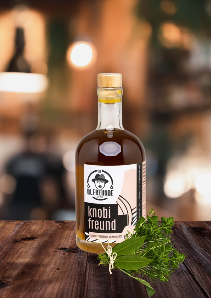 Vampire aufgepasst – hier kommt der Knobifreund! Für alle, die Knoblauch und intensiven Geschmack lieben, ist dieses aromatische Speiseöl genau das Richtige. In der edlen 0,5 l-Flasche mit Holzgriff-Korkverschluss ist es ein echter Hingucker und ein tolles Geschenk.
