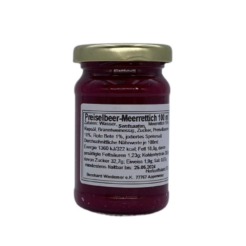 Zutaten: Senfsaaten, Meerrettich 15%, Preiselbeeren 10%, Rote Beete 1%, Wasser, Rapsöl, Branntweinessig, jodiertes Speisesalz, Zucker, Antioxidationsmittel: Natriummetabisulfit