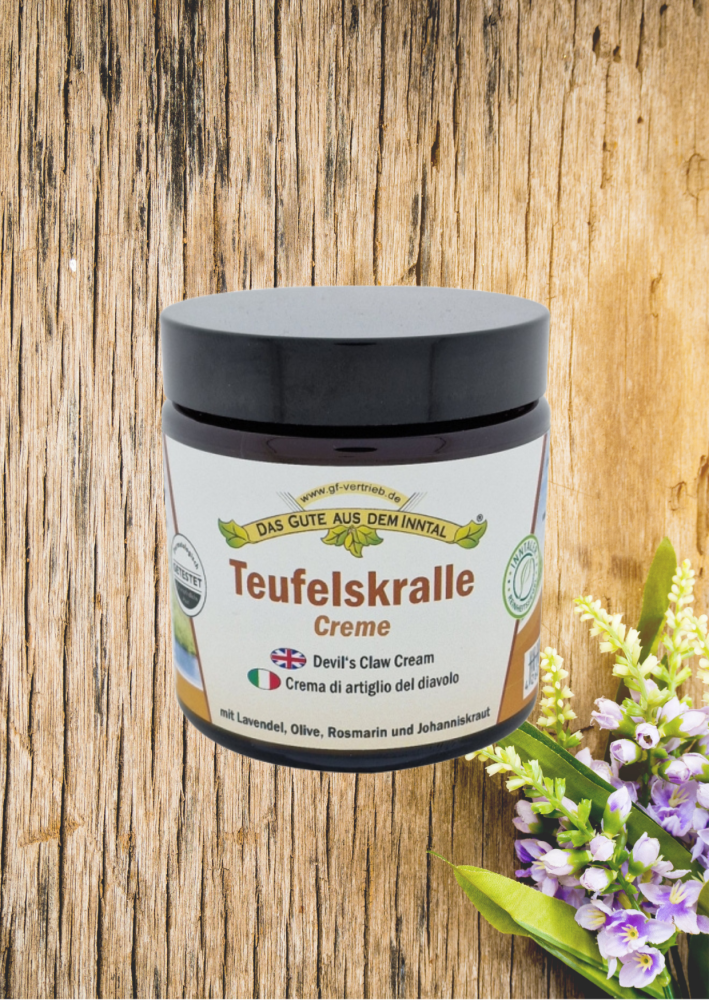 Die Teufelskralle Creme vereint die bewährte Kraft der Teufelskralle mit den pflegenden Eigenschaften von Lavendel, Olive, Rosmarin und Johanniskraut. Sie unterstützt gezielt bei Muskel- und Gelenkbeschwerden, wirkt wohltuend entspannend und fördert die Durchblutung.