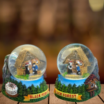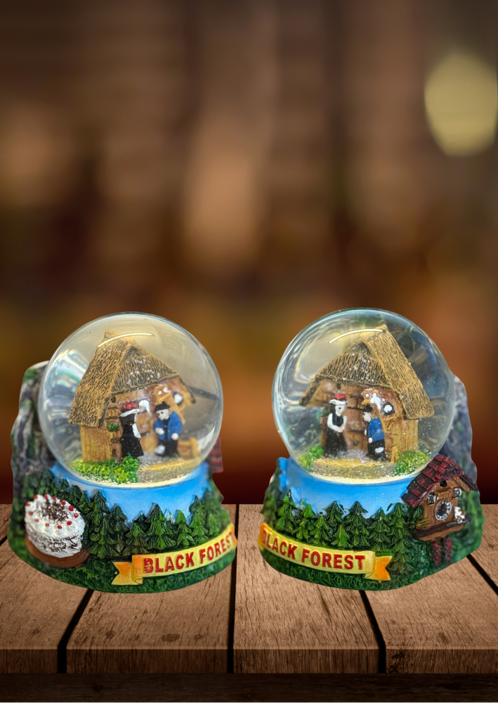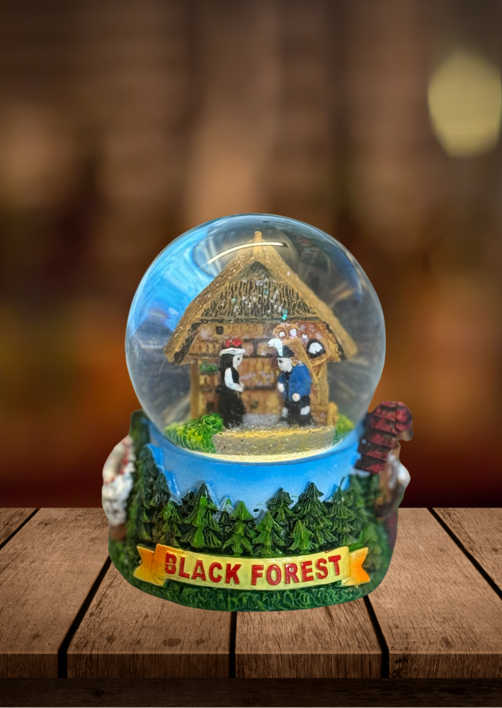 Schneekugel Schwarzwald – Diese detailreich verzierte Schneekugel zeigt ein traditionelles Schwarzwaldmotiv mit Uhrenträger und Schwarzwaldmädel. Ein liebevoll gestaltetes Sammlerstück und perfektes Geschenk – ein Muss für alle Schwarzwaldliebhaber.