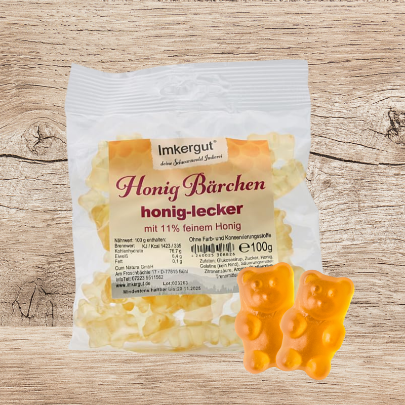 Die originalen Honigbärchen von Imkergut sind ein wahrer Genuss. Im praktischen 100g-Beutel sind sie perfekt zum Naschen zwischendurch. Mit einem Anteil von 11 % feinstem Bio-Honig aus der Schwarzwald-Imkerei von Imkergut kommt jeder Honig-Liebhaber auf seine Kosten. Noch dazu kommen die Honig-Bärchen von Imkergut ohne viele Zutaten aus – sie sind glutenfrei und laktosefrei sowie frei von Farb- und Konservierungsstoffen, sodass möglichst viele Menschen in ihren Genuss kommen können.