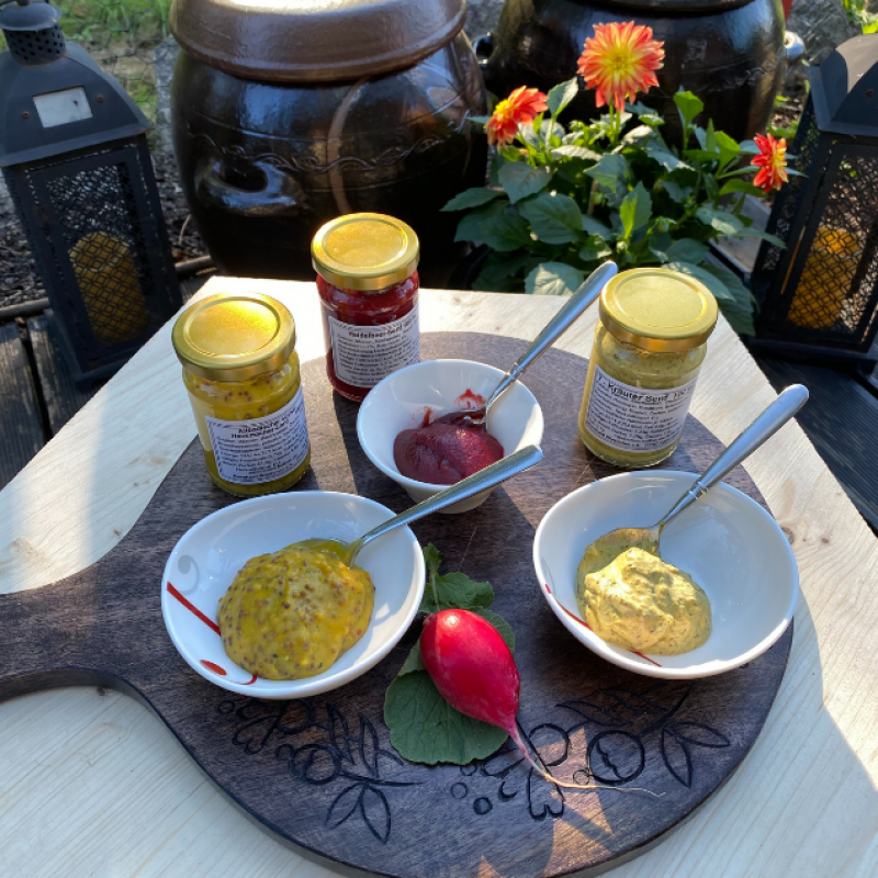 The sweet mustards are not so spicy and thus taste good directly as a sauce or as a dip for a piece of cheese.
