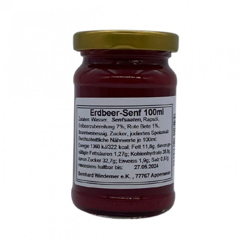 Ingredients: Strawberry preparation 7%, beet 1%, water, mustard seeds, sugar, rapeseed oil, spirit vinegar, iodized table salt.